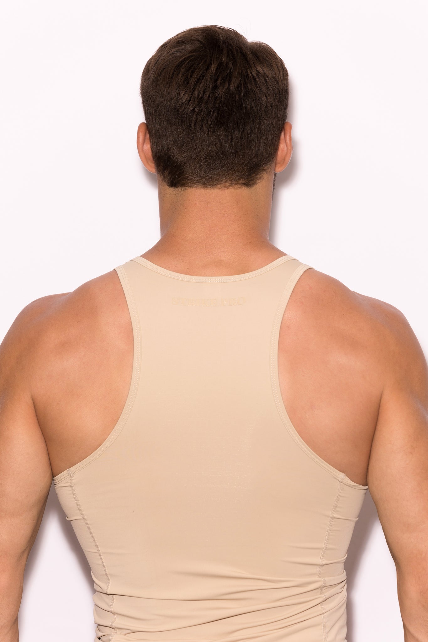 STRIKE PRO Dune Men's Sports Tank - a high stretch, silky soft and lightweight sports tank with a racer neck back and scoop front. Discreet tonal silicone print branding on the back neck. With flat lock, soft touch seams throughout and removable paper care label for maximum comfort